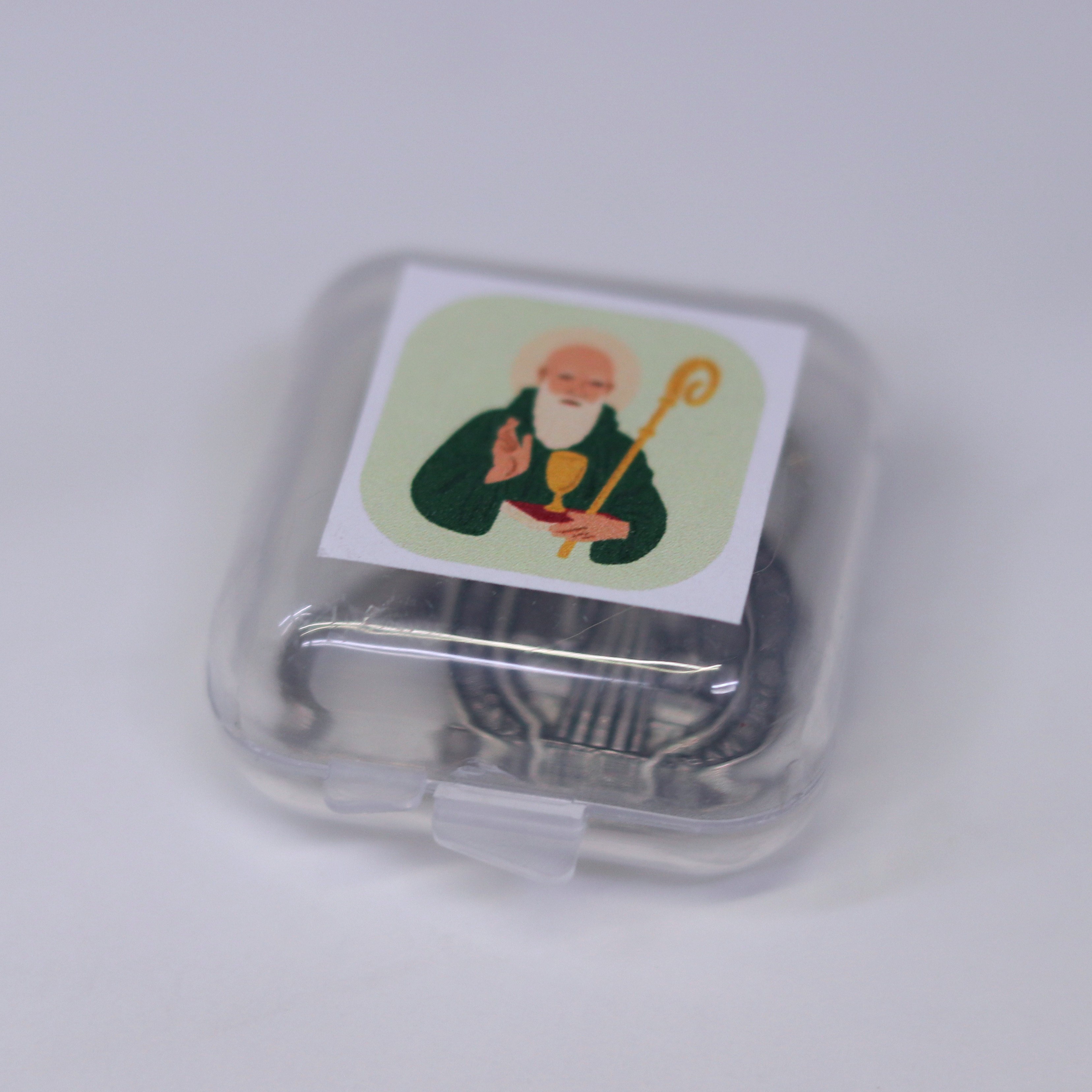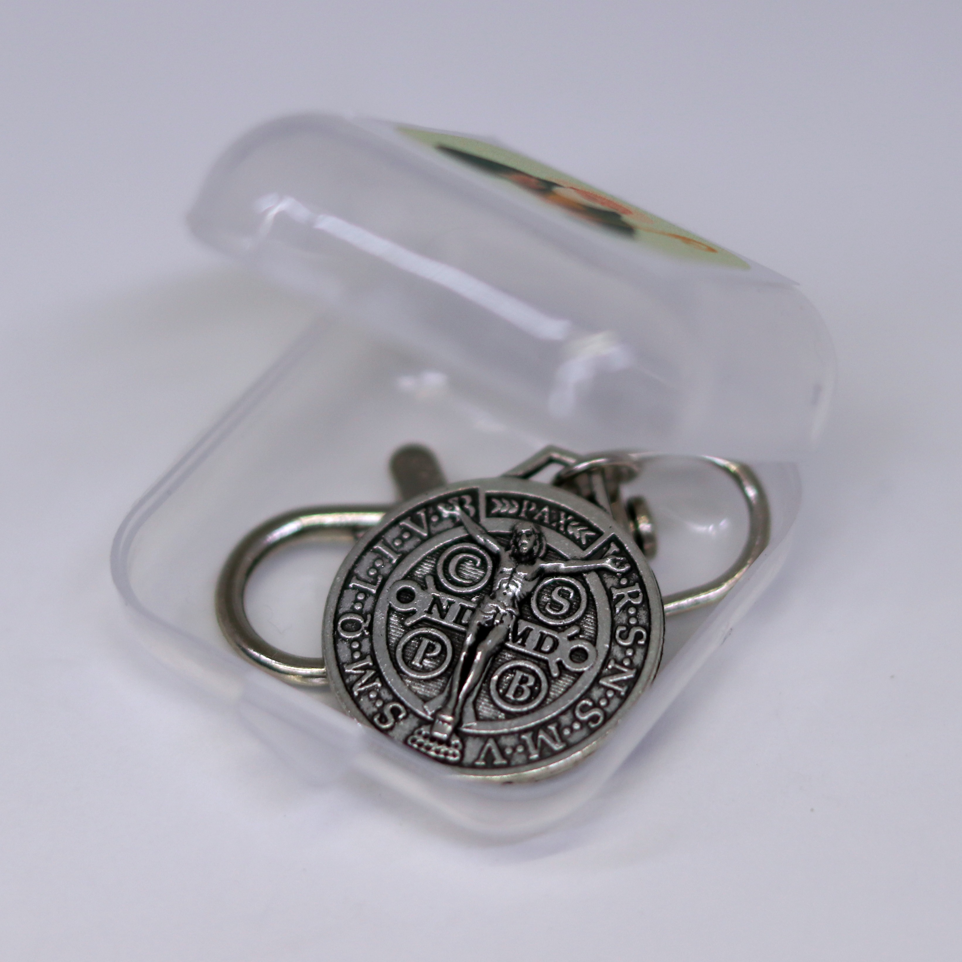 Ukryty w pięknym, kompaktowym i skromnym pudełeczku i niosący tak piękne przesłanie brelok z wizerunkiem Św. Benedykta.