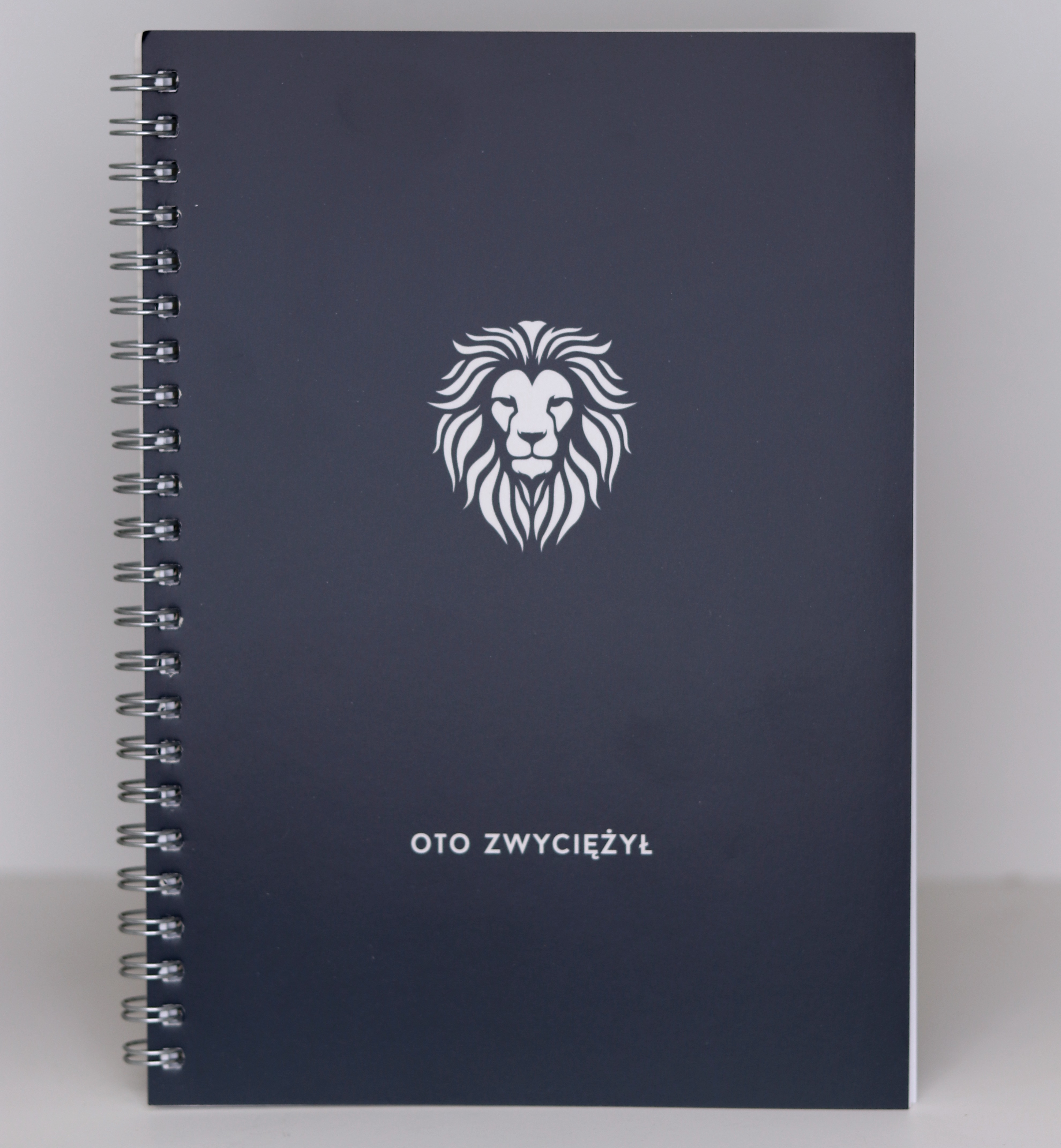 Czarny notatnik z minimalistycznym lwem i napisem znaczącym więcej niż tysiąc słów. Ap 5,5a.